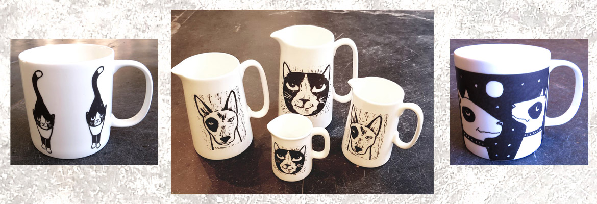 Our lino print designs are available to order on a high quality straight sided farmhouse style jug which holds a quarter pint of liquid. 7 CMS X 4 CMS